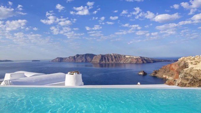 Katikies – a complex of bridges, cubist cottages and infinity pools – is considered one of the most romantic boutique hotels in Santorini. Hugging the dramatic volcanic rim, the property is a natural fit for honeymooners, romantics and couples. The white washed suites have classic arched ceilings and majestic views of the Aegean Sea, which can be enjoyed from the large terrace with an open-air dining area, sun deck and two-person Jacuzzi. For the ultimate romantic meal, the restaurant provides the perfect setting with just four candlelit tables perched on a secret verandah rooftop overlooking the Caldera. The better-known Kirini pool restaurant offers the same breathtaking panoramas, plus a fresh, seasonal menu of traditional Mediterranean dishes. Awe inspiring views, sublime Santorini sunsets and perfectly manicured pink bougainvilleas provide the magnificent backdrop for this perennially gleaming, glistening white luxury hotel that spills down the cliffs of the impressive caldera.