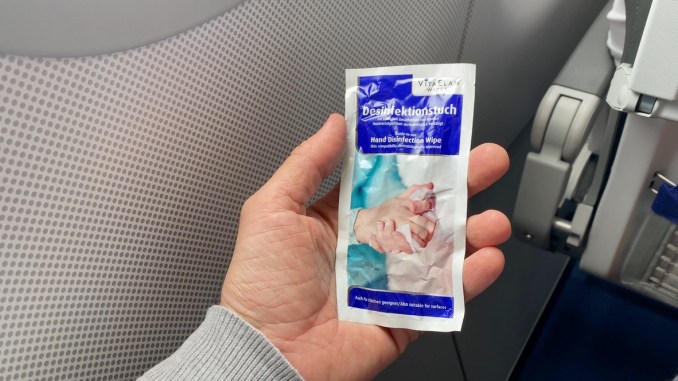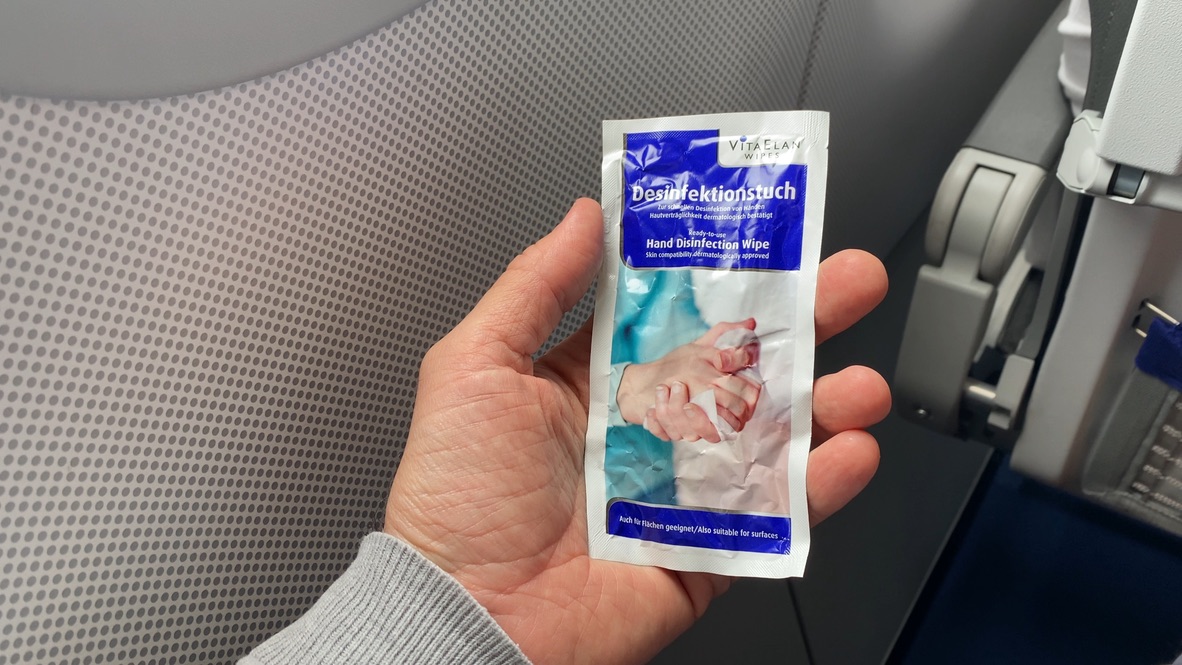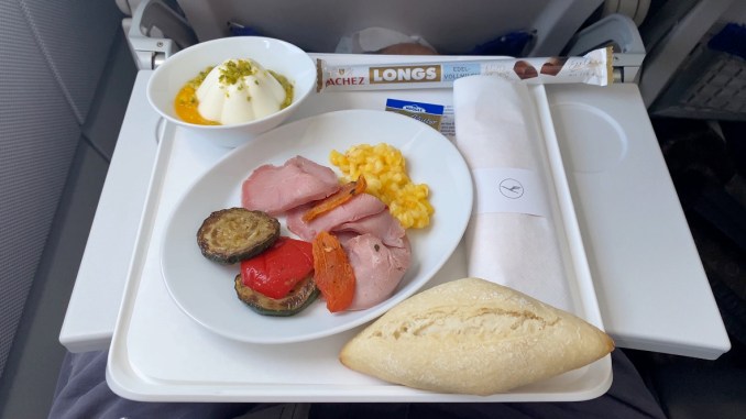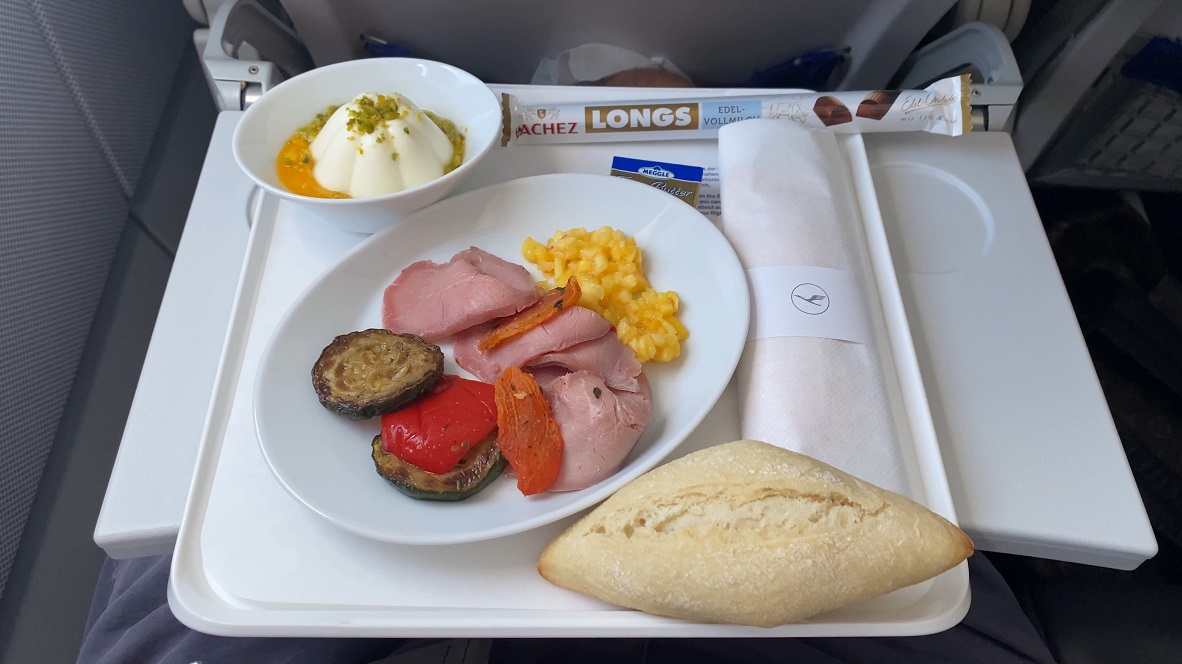 A hand sanitizer wipe was provided upon boarding (I guess it will take some time before hot towels return to Business Class). Lunch was offered shortly after takeoff, with the meal served on a single tray: smoked ham, roasted vegetables, dried apricots, and mango compot, with passionfruit panna cotta as well as a bar of milk chocolate as dessert. The meal was a bit disappointing compared to my other intra-European Business Class flights with Lufthansa.