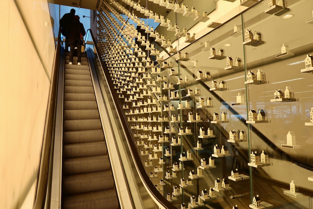 The entrance to the KLM House is immediately noticeable by its illuminated glass wall adorned with some five thousand Delft blue miniature houses (more on that below). Visitors access the lounge by an escalator to the first floor, where they are warmly welcomed by the lounge’s personal assistants. A white marble desk at the lounge’s entrance underneath four chandeliers takes the shape of a giant KLM logo.