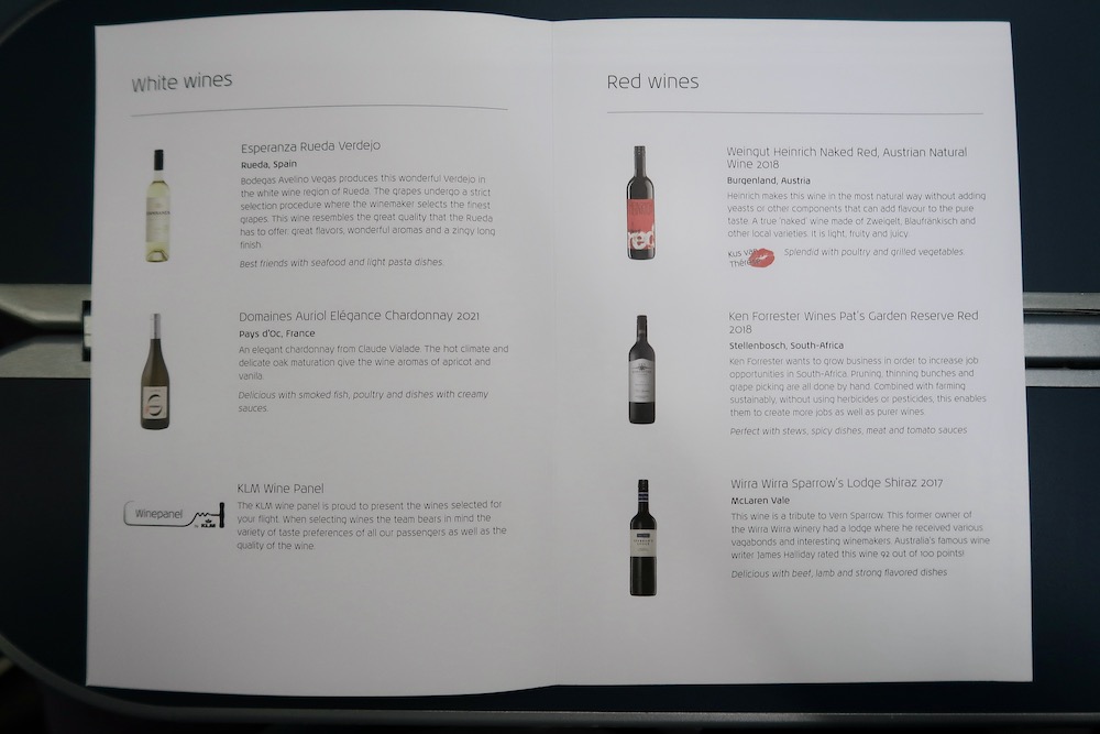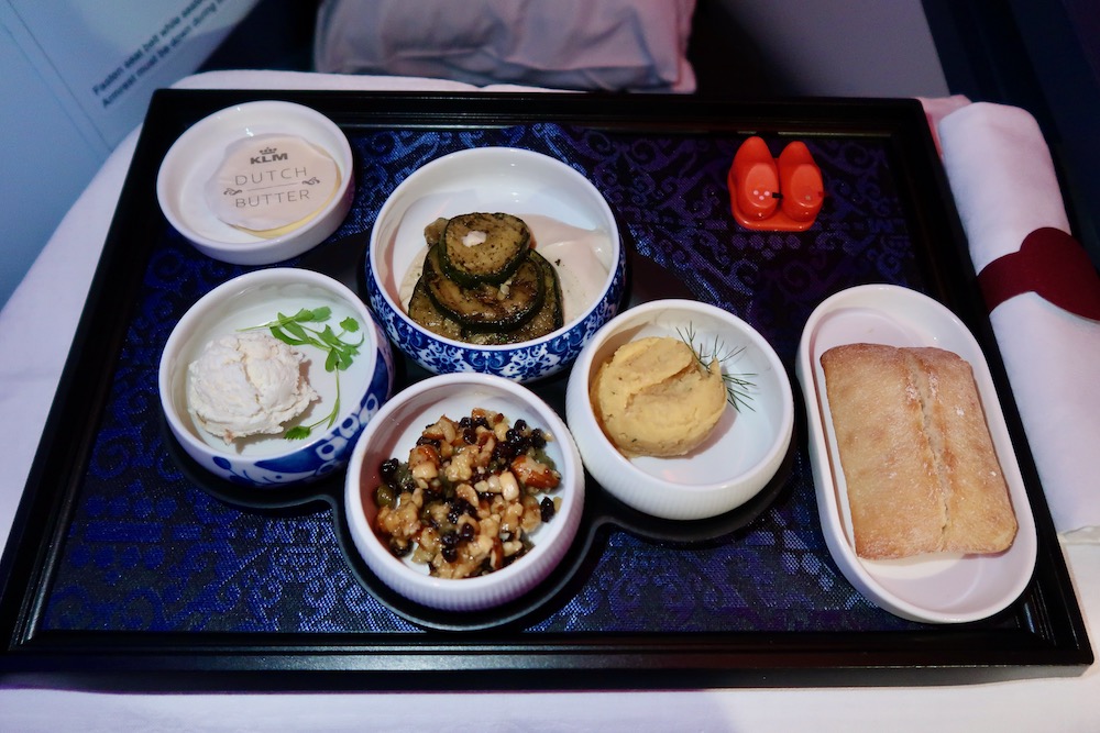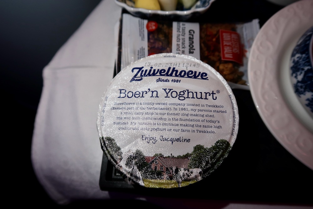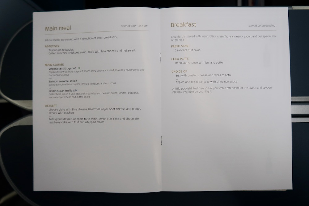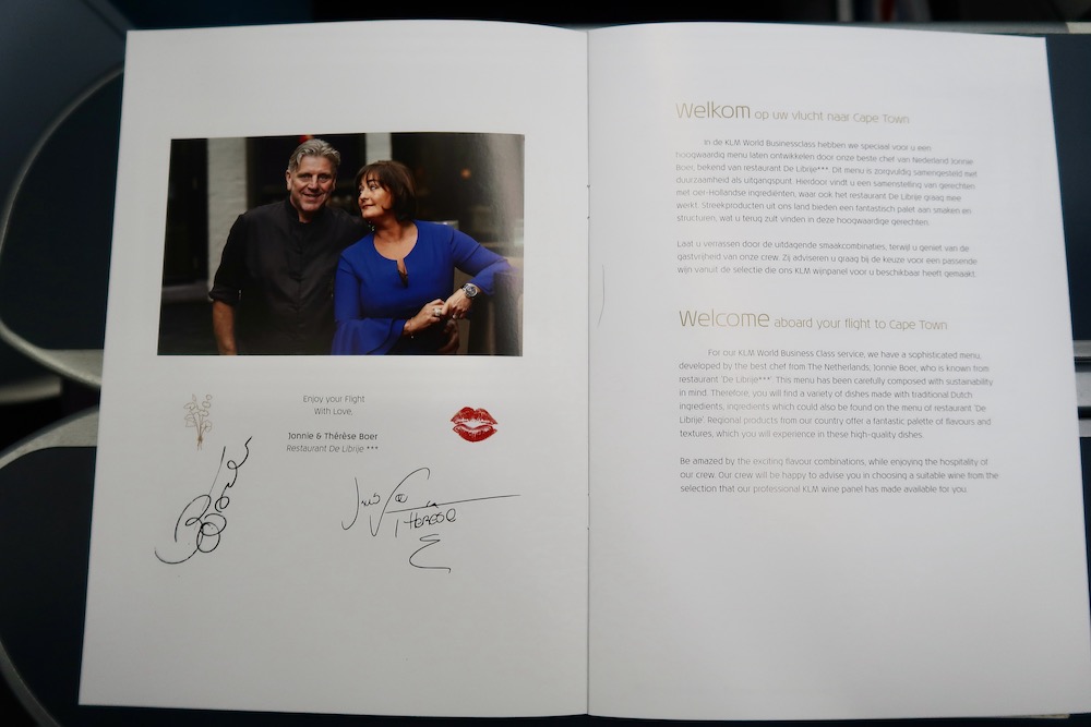 During this overnight flight, two meals were offered: a dinner after takeoff and a breakfast before landing. The beautifully designed menus (with references to Delft tiles & houses) were extensive and offered excellent wine pairings. The dishes were created by Chef Jonnie Boer, considered to be the most prominent chef in the Netherlands. Jonnie Boer, awarded with three Michelin stars since 2004, focuses on the flavor of his region and is co-owner of the restaurant De Librije in Zwolle.