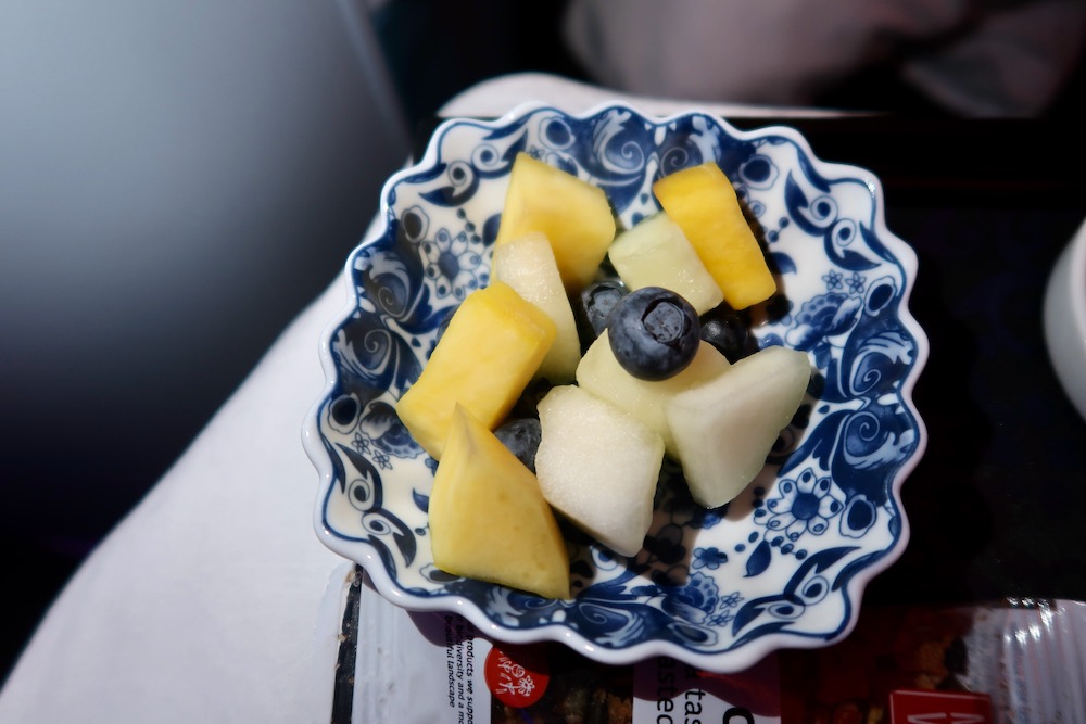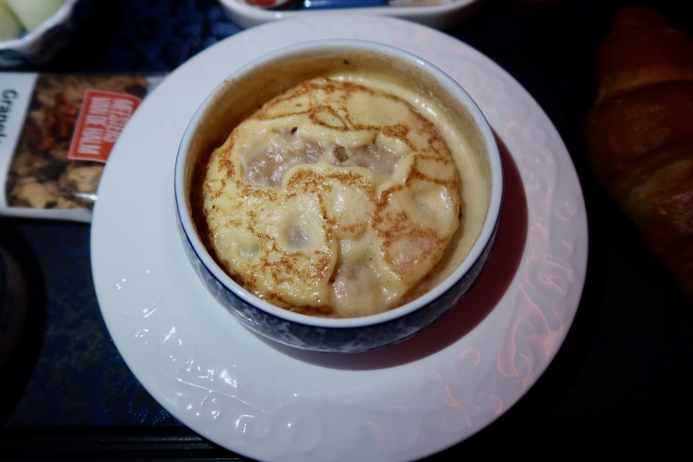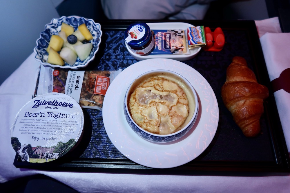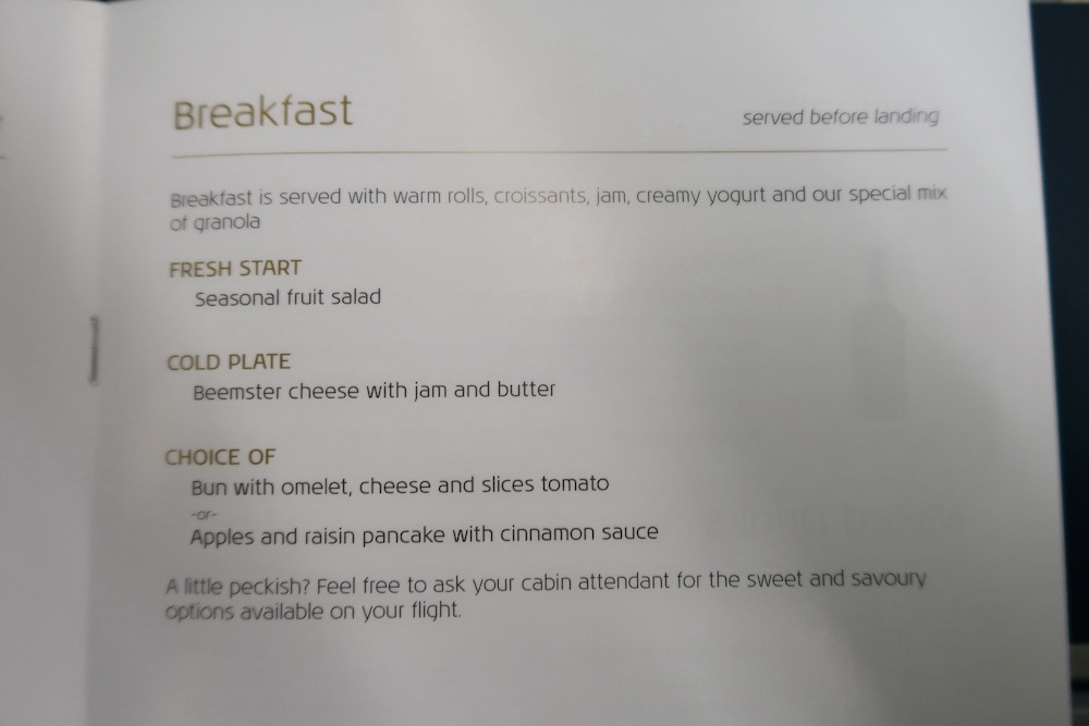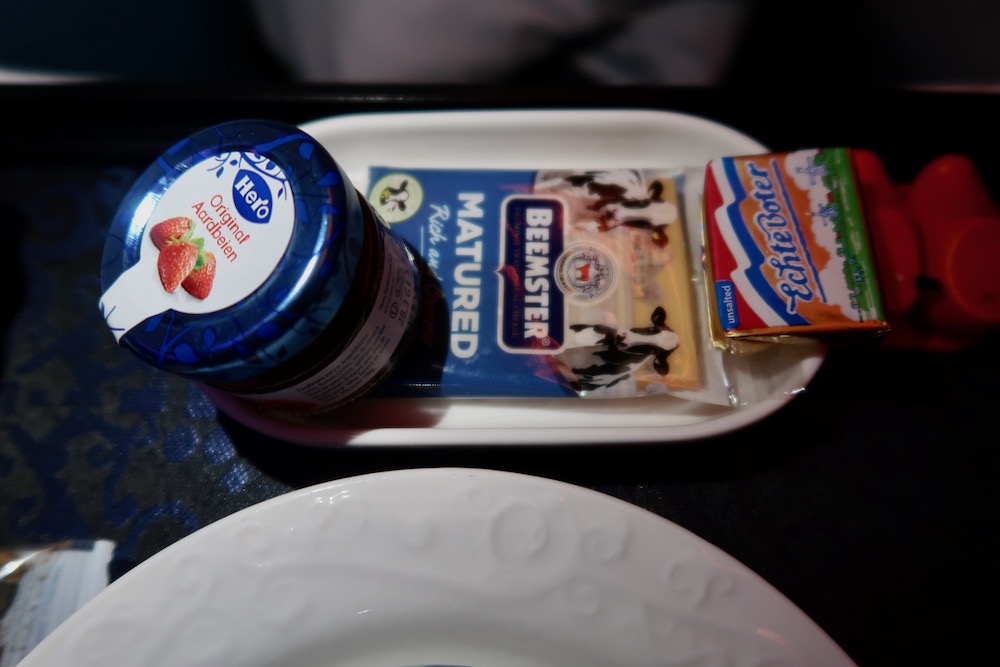Breakfast service started 90 minutes prior to landing in Cape Town, and comprised a seasonal fruit salad, a cold plat (Beemster cheese with jam and butter) and a hot dish (apples and raisin pancake with cinnamon sauce). The breakfast was served with warm rolls, croissants, jam, yoghurt and a granola mix.