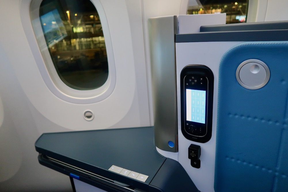 KLM has installed the popular Zodiac Aerospace-made Cirrus Business Class seat onboard its Boeing 787-9 planes. With a pitch of 106 cm (42 inches) and a width of 53 cm (21 inch), the seat feels comfortable and private. Each seat is located in its own shell, and features luxurious accents, such as soft padded blue leather on the shell’s interior wall.