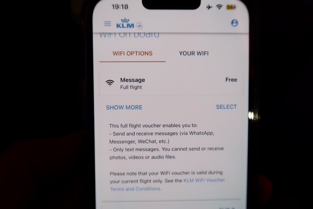 KLM offers WiFi onboard its Boeing 787 Dreamlines and free messaging is available to all passengers during the entire flight (how great is that!). This lets you send and receive text messages via WhatsApp, Messenger, WeChat, and similar services. Note that you cannot send or receive photos, videos, or audio files.