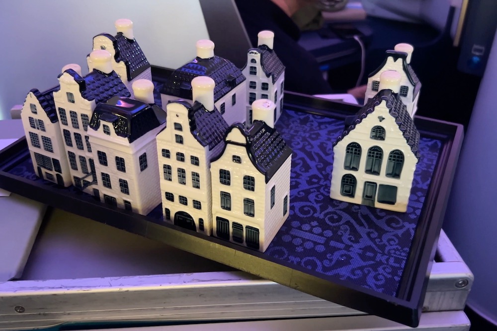 Shortly before landing, KLM’s longhaul Business Class passengers receive a wonderful gift: a Delft Blue miniature traditional Dutch house, filled with Dutch gin, also known as “jenever.” Each miniature depicts a real Dutch house. KLM has been presenting Business Class passenger with this gift since 1952. Every year on October 7th, the airline celebrates the anniversary of its founding in 1919 by presenting a new house. Over the years, these miniature houses have become desirable collectors’ items, even generating a lively trade among passengers. KLM has a site where you can keep track of all of the houses, as each one is unique and has a special story to tell.
