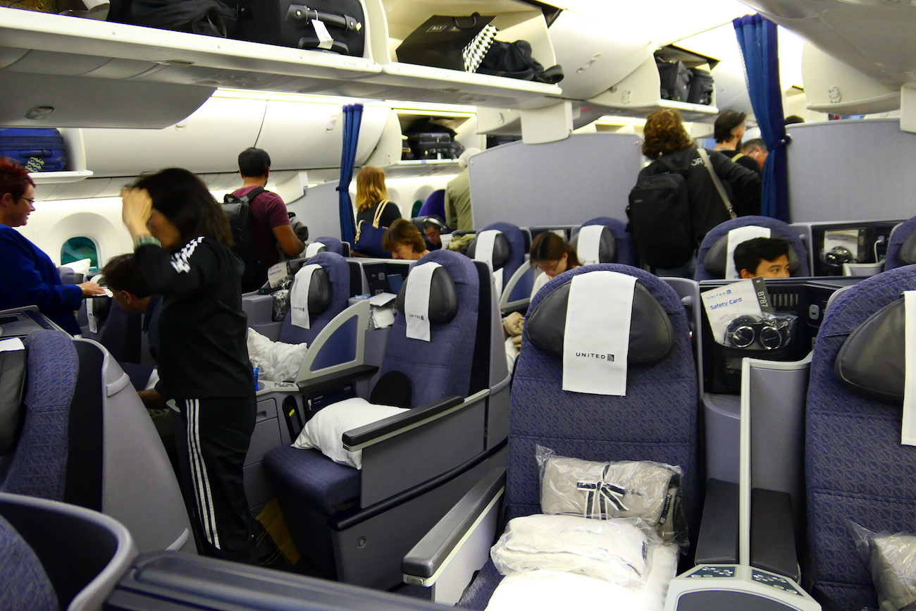 United’s B787-9 planes seat 252 passengers in total: 48 in Business Class, 88 in Economy Plus, and 116 in Economy Class. The 48 Business Class fully flat-bed seats are spread over two cabins, with a galley in between them: the forward Business Class cabin features 30 seats in 5 rows, while the second and smaller cabin – which is located further back, in front of the Economy Plus cabin – consists of only 3 rows with 18 seats in total. In both cabins, the seats are placed in a traditional 2-2-2 layout and slightly angled towards the windows. Adjoining seats are staggered by a couple of inches (cm), which – together with a small partition – offers some extra privacy in case you are seated next to a stranger and at the same time allows enough interaction when you are traveling with a companion. All seats face forward and have aisle access, except for the window seats (where you will have to climb over the legs of your neighbour to get to the aisle).