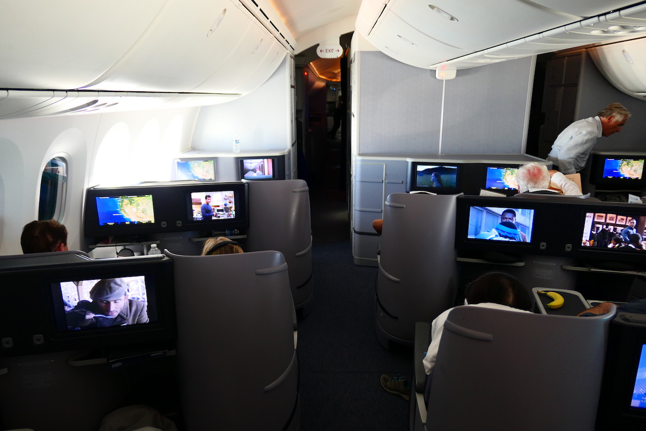 • The 2-2-2 Business Class layout does not make the cabin very attractive for solo travelers, since you will always end up sitting next to a stranger. There is a small screen though between adjoining seats which are also staggered by a couple of inches, creating some extra levels of privacy (albeit not enough in my opinion).